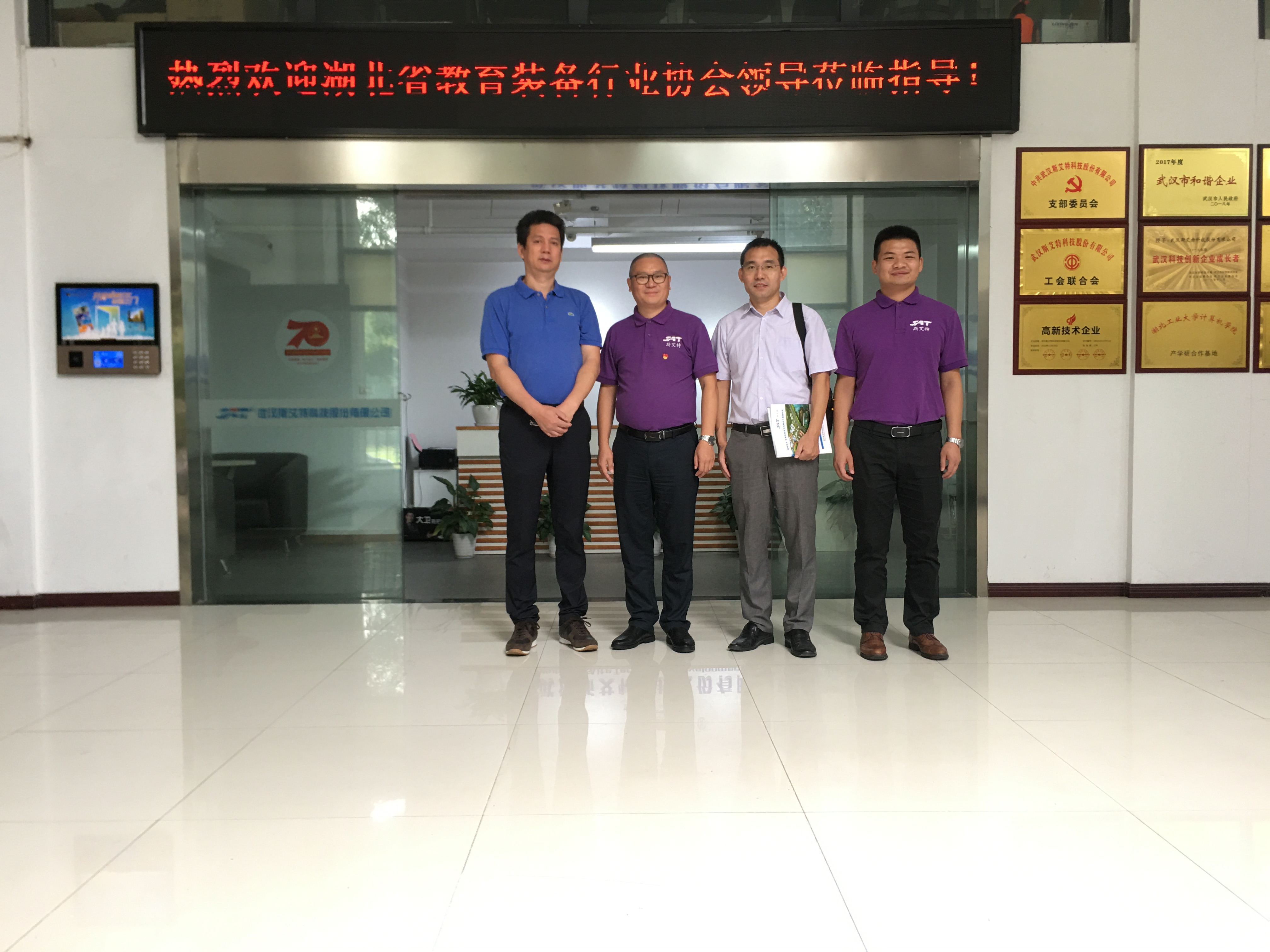 2020年09月11日上午,湖北省教育裝備行業協會秘書長師明義等一行3人,蒞臨我司走訪和考察。我司行政人事部負責人向麗,公司副總經理、智慧平安校園事業部總經理張厚元及部門人員對幾位領導的到來表示熱烈歡迎。