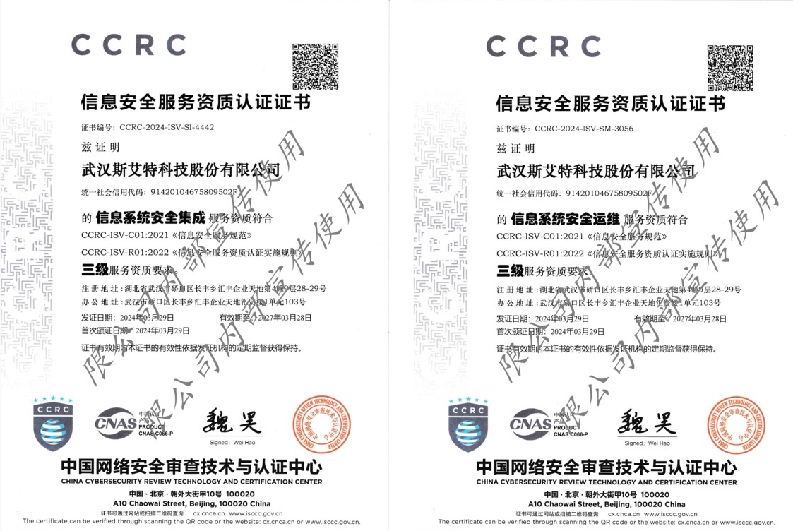 2024年3月,武漢斯艾特科技股份有限公司順利通過中國網絡安全審查技術與認證中心(CCRC)的嚴格審核,4月成功獲得信息系統安全集成服務和信息系統安全運維服務兩個方向的資質認證證書。